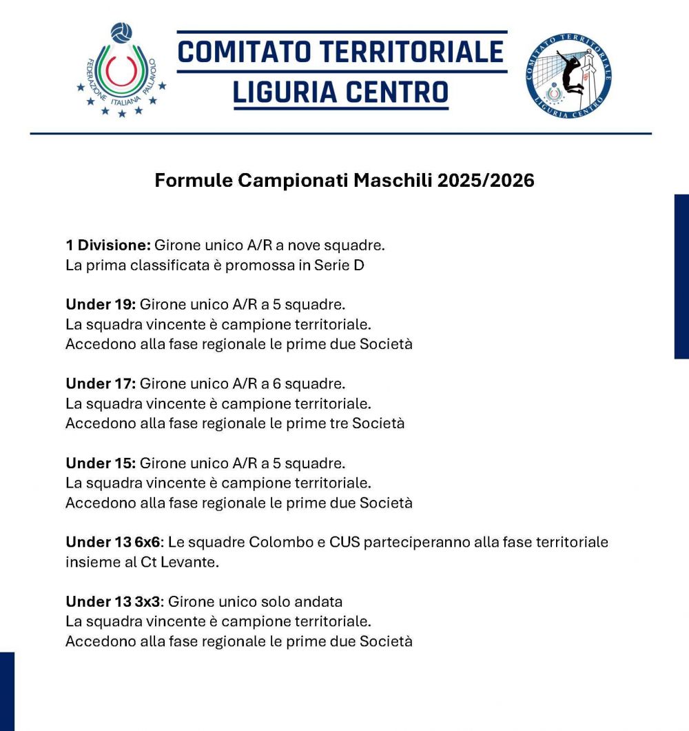 Allegato il documento con le formule di svolgimento dei campionati maschili per il 2025-26.